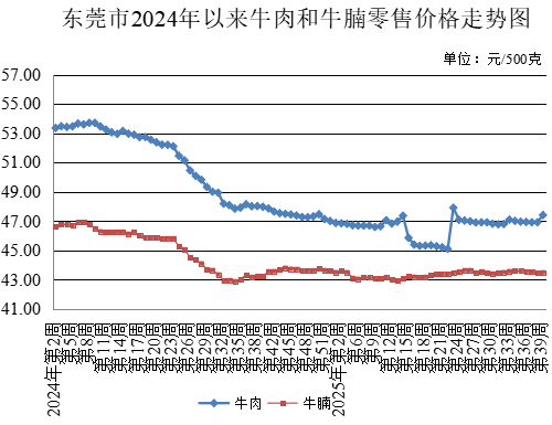 第39周,监测的牛肉农贸市场零售均价为每500克47.40元,较上周上升1.04%。牛腩农贸市场零售均价为每500克43.49元,较上周上升0.05%。鸡肉农贸市场零售均价为每500克16.88元,较上周上升1.88%。